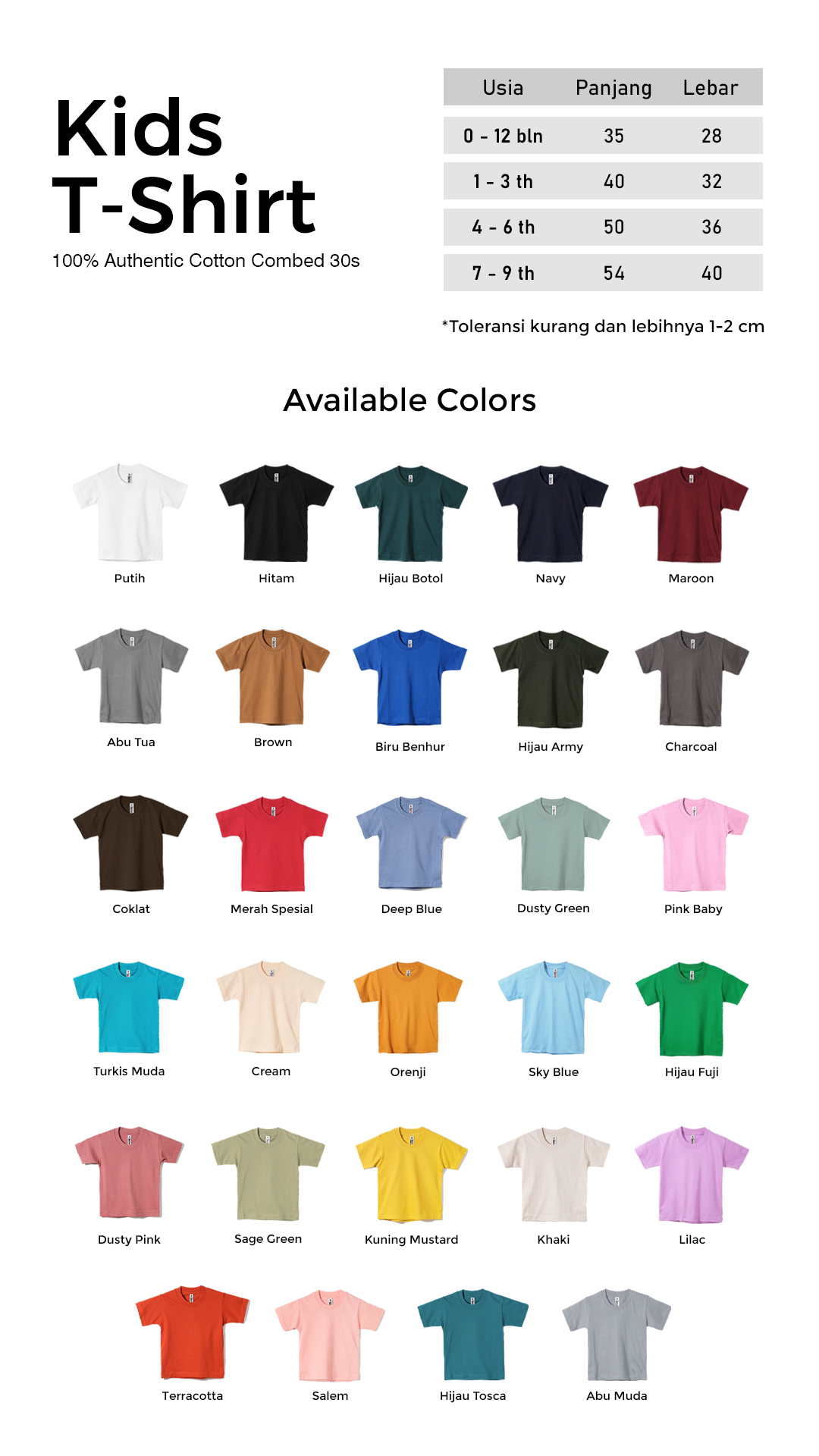 | UKURAN | ( 0-12 bln ) 35 cm x 28 cm, ( 1 – 3 thn ) 40 cm x 32 cm, ( 4 – 6 thn ) 50 cm x 36 cm, ( 7 – 9 thn) 54 cm x 40 cm |